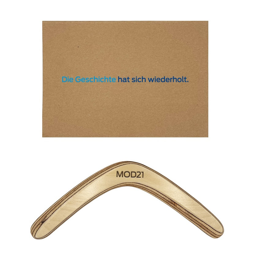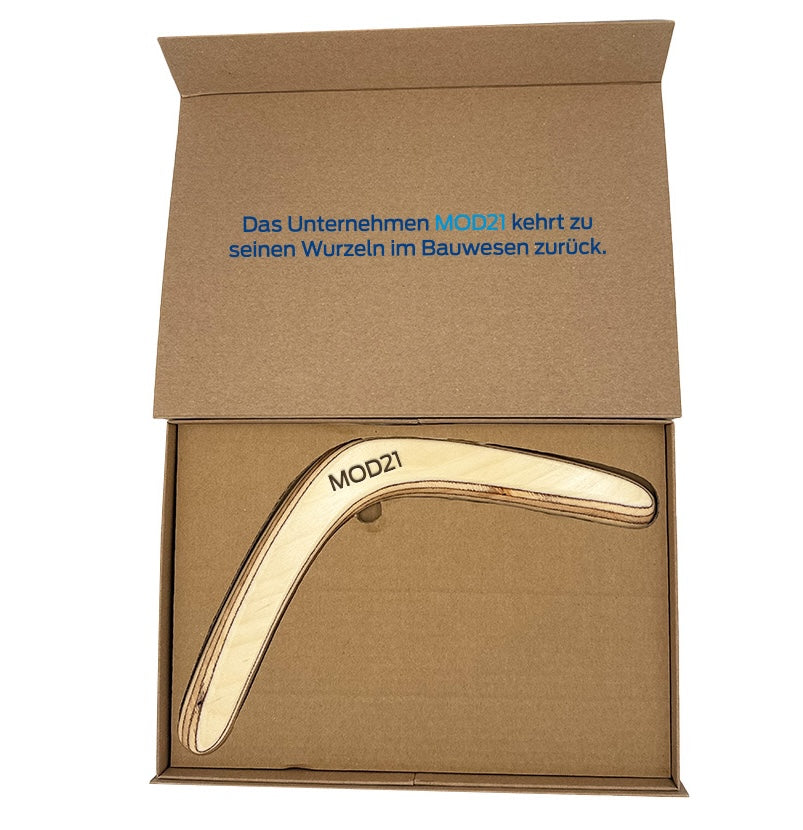Drewniany bumerang z grawerowanym logo MOD21. Pudełko z napisem w wersji niemiecko-języcznej.
